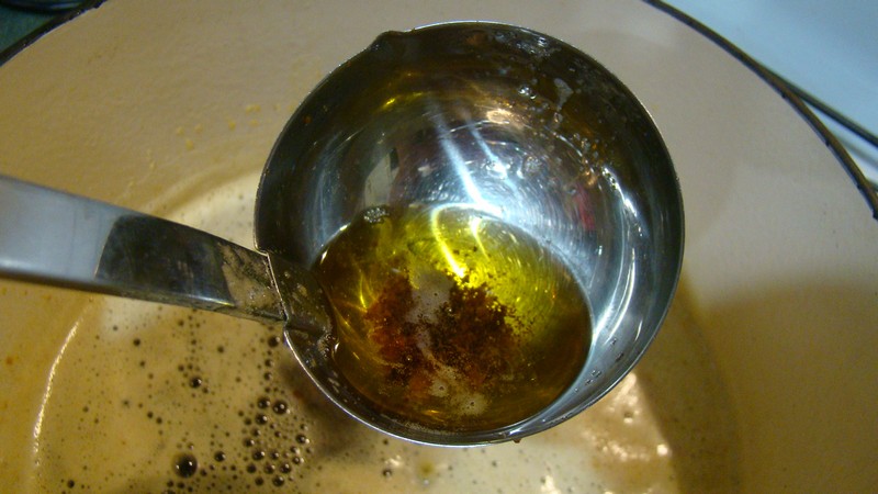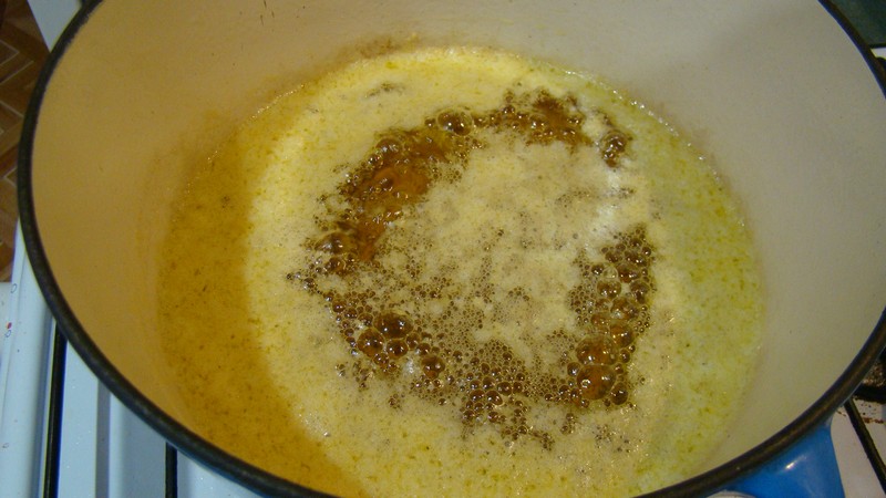 When the solids on the bottom of the pan have turned golden brown, the ghee is ready to strain.
